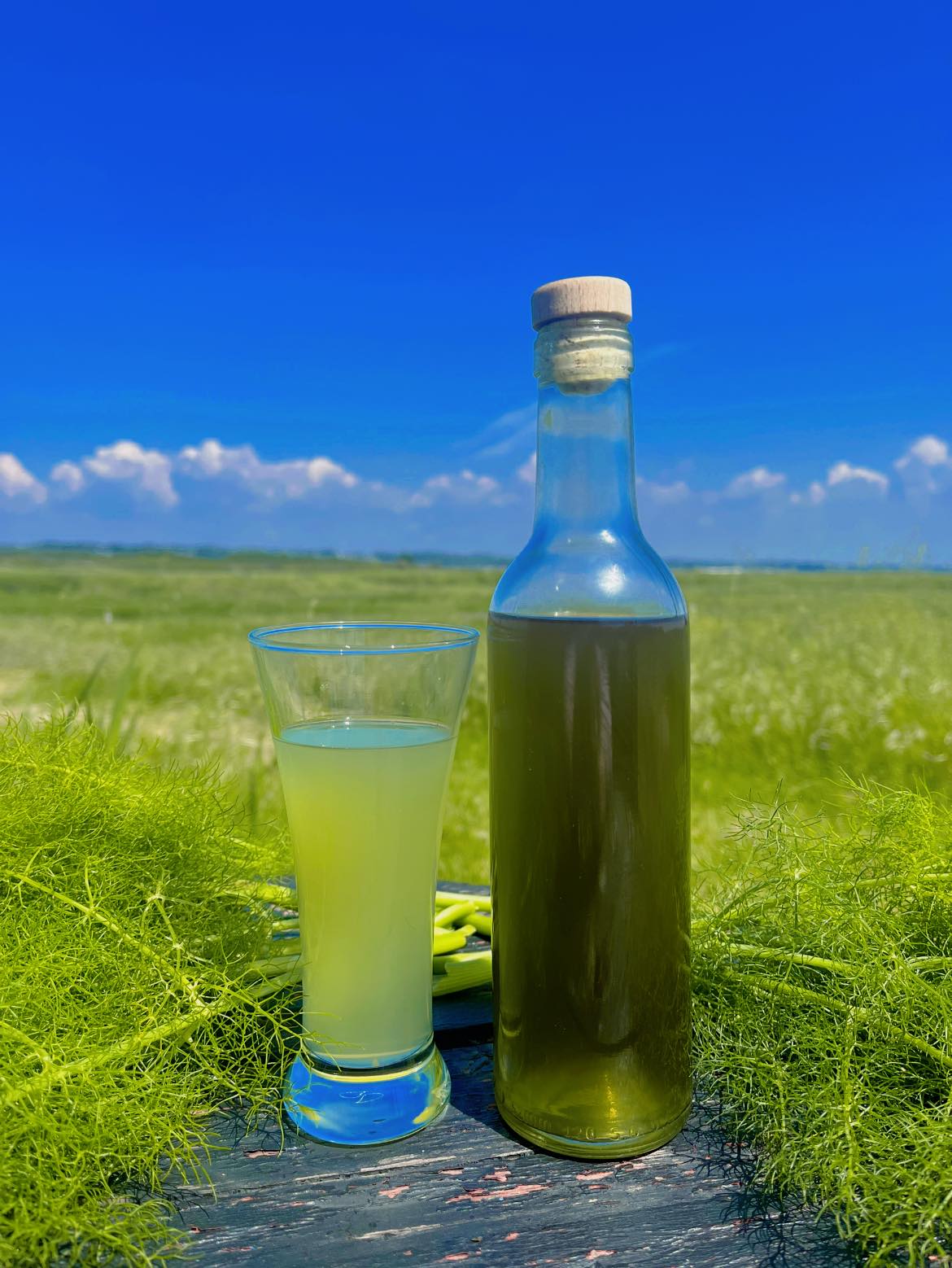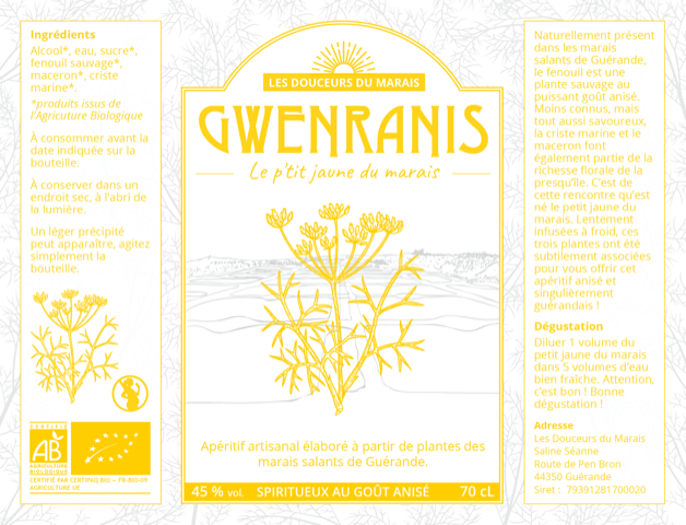 Ingrédients : alcool*, eau, sucre*, fenouil sauvage*, maceron*, criste marine*